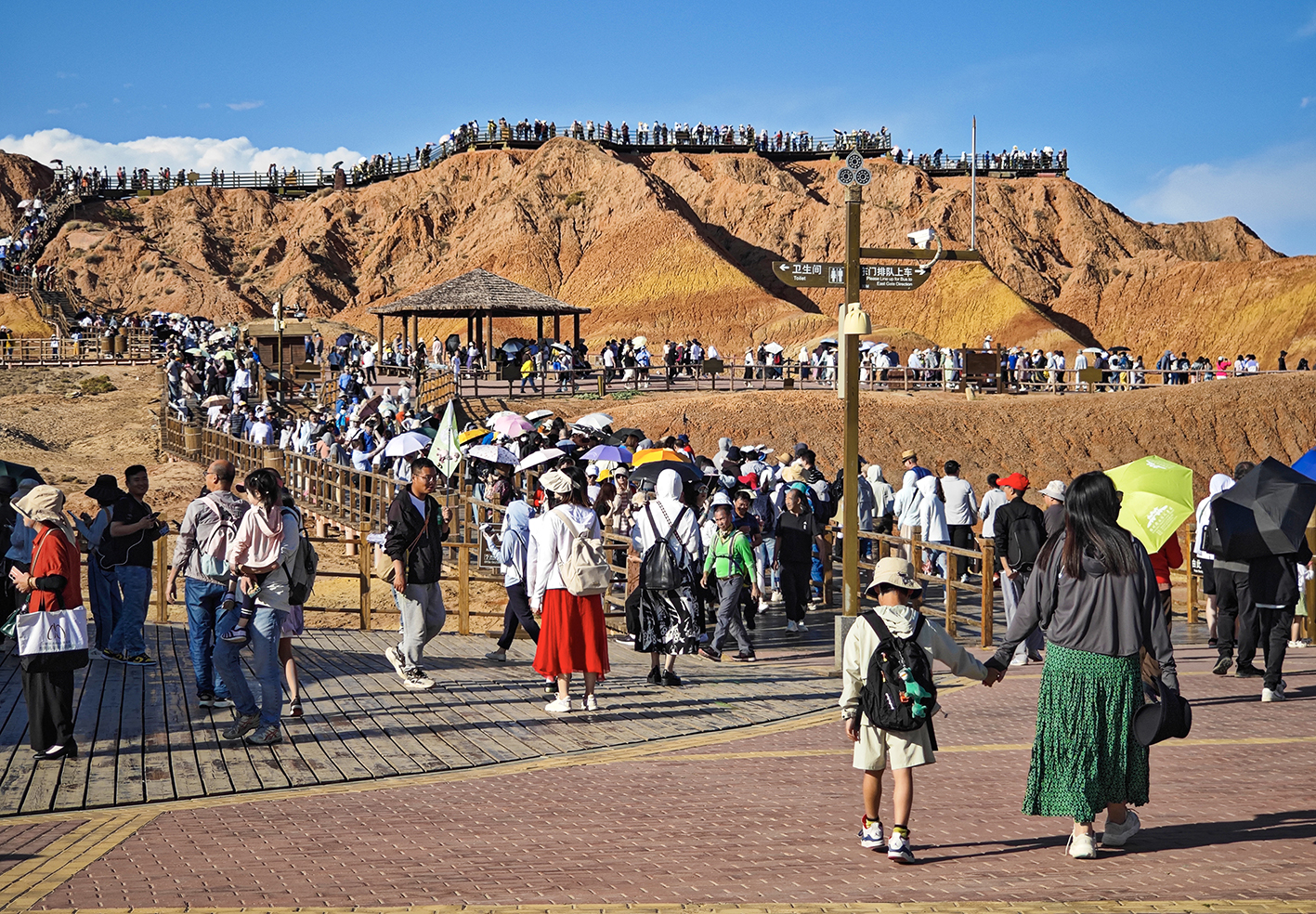 張掖七彩丹霞景區作為全球唯一的丹霞地貌與彩色丘陵的復合區,以艷麗的色彩、獨特的造型享譽全球,是世界十大神奇地理奇觀和全球最刻骨銘心的22處風景之一,已成為中外游客的向往之地。特別是高考結束后,八方游客紛至沓來,景區內各觀景臺上人頭攢動,游客們紛紛舉起手機,定格自己與“七彩畫卷”的美麗邂逅。