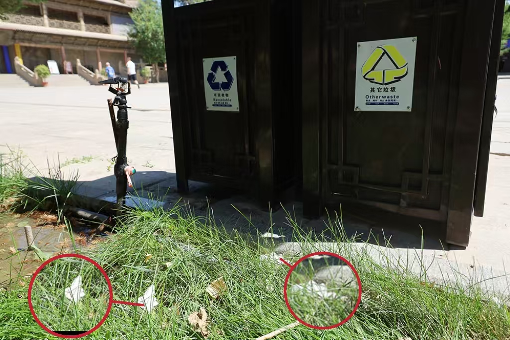 景區每隔一段距離都有固定的垃圾箱,上面還張貼著“垃圾分類保護環境”文明標語,但垃圾仍丟在垃圾桶旁。