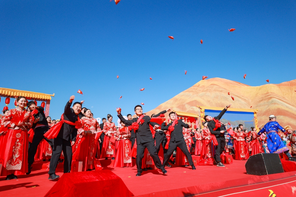 儀式結束后,新人、金婚夫婦還在張掖丹霞國家地質公園打卡留念,暢游七彩丹霞。“今天,我們在美麗的七彩丹霞與百對新人共赴愛的旅程,滿滿的儀式感使我對未來的美好生活充滿了信心和憧憬。”新人保學龍表示。