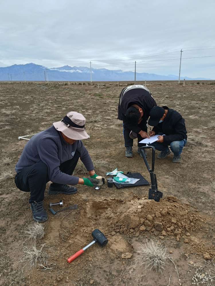 9月7日清晨,在行駛了260公里以后,在高臺縣羅城鄉鹽池村,張掖市林業科學研究院林草碳匯野外調查工作專班又開始了手頭的工作。身著工作服,他們始終躬身伏在地面,像“尋寶”一般挖土、取樣、記錄、測算……盡管頂著遮陽帽,終日的室外作業依舊讓大家原本白皙的臉被悄悄鍍上了一層黝黑色。方便面、速食餐是繁忙工作里的標配,跑斷腿、看花眼、曬破皮,但這些在科研人員看來,都不是最難的,“有新發現、攻克技術難題”才是大家最大的欣慰。