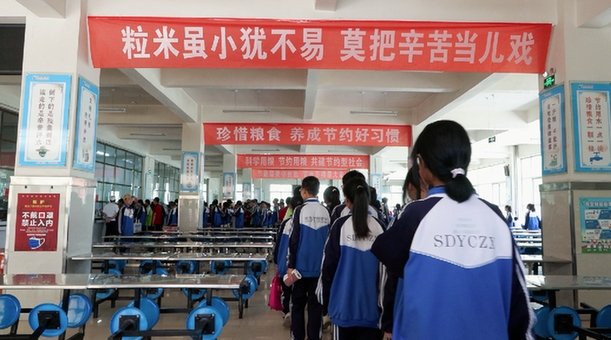 午餐時間,走進山丹育才中學學生食堂,墻壁上張貼著醒目的“珍惜糧食、反對浪費”的宣傳標語和節約糧食的名言古句。學生們井然有序的排隊取餐,食堂管理員在給學生打飯的同時,不時地提醒學生點餐的過程中要按需、少量、多次取餐,要提倡“光盤行動”。