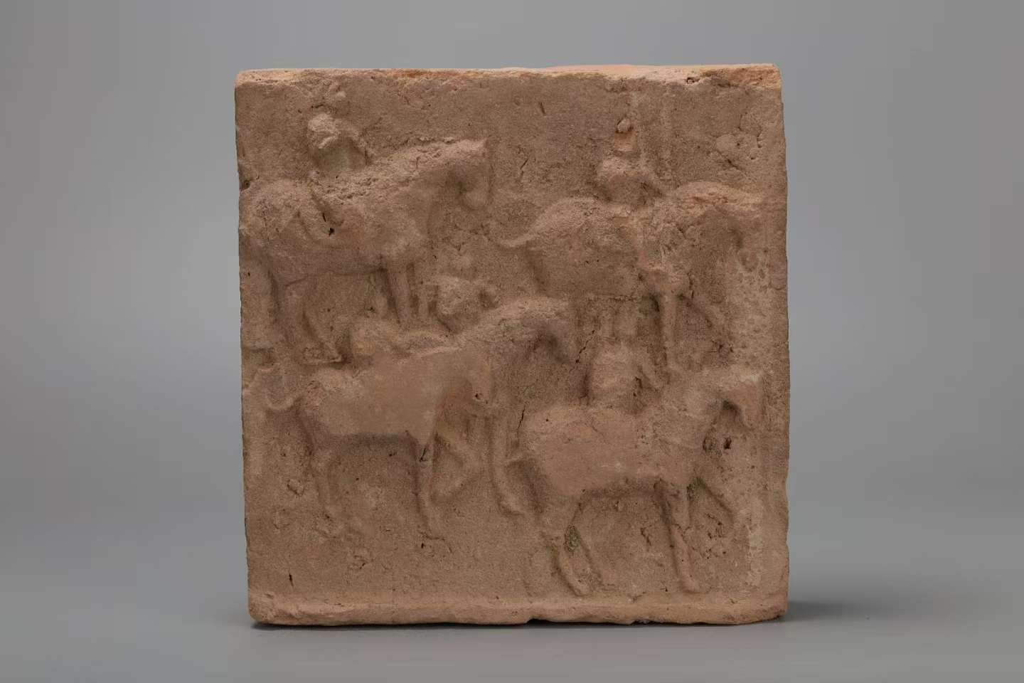 唐代是中國歷史上最鼎盛的一個朝代,經濟繁榮、文化昌盛、思想包容、藝術恢弘、民族融合。唐代的文化影響輻射亞洲,并通過絲綢之路傳播到歐洲。張掖,地處絲綢之路咽喉,民族走廊與千年古道在這里接通交匯,文明的火光在這里碰撞融合,文化的光芒在這里交融薈萃,歷史上曾有多個民族聚居生活,有多種文明交流融匯,遺存和文物具有絲綢之路的獨特印記。此次展覽遴選張掖市博物館、甘州區博物館館藏模印騎馬武士圖墓磚和牽馬圖墓磚、山丹縣博物館館藏模印彩繪胡商牽駝畫像磚和肅南裕固族自治縣民族博物館藏鑲綠松石金壺共4件文物。