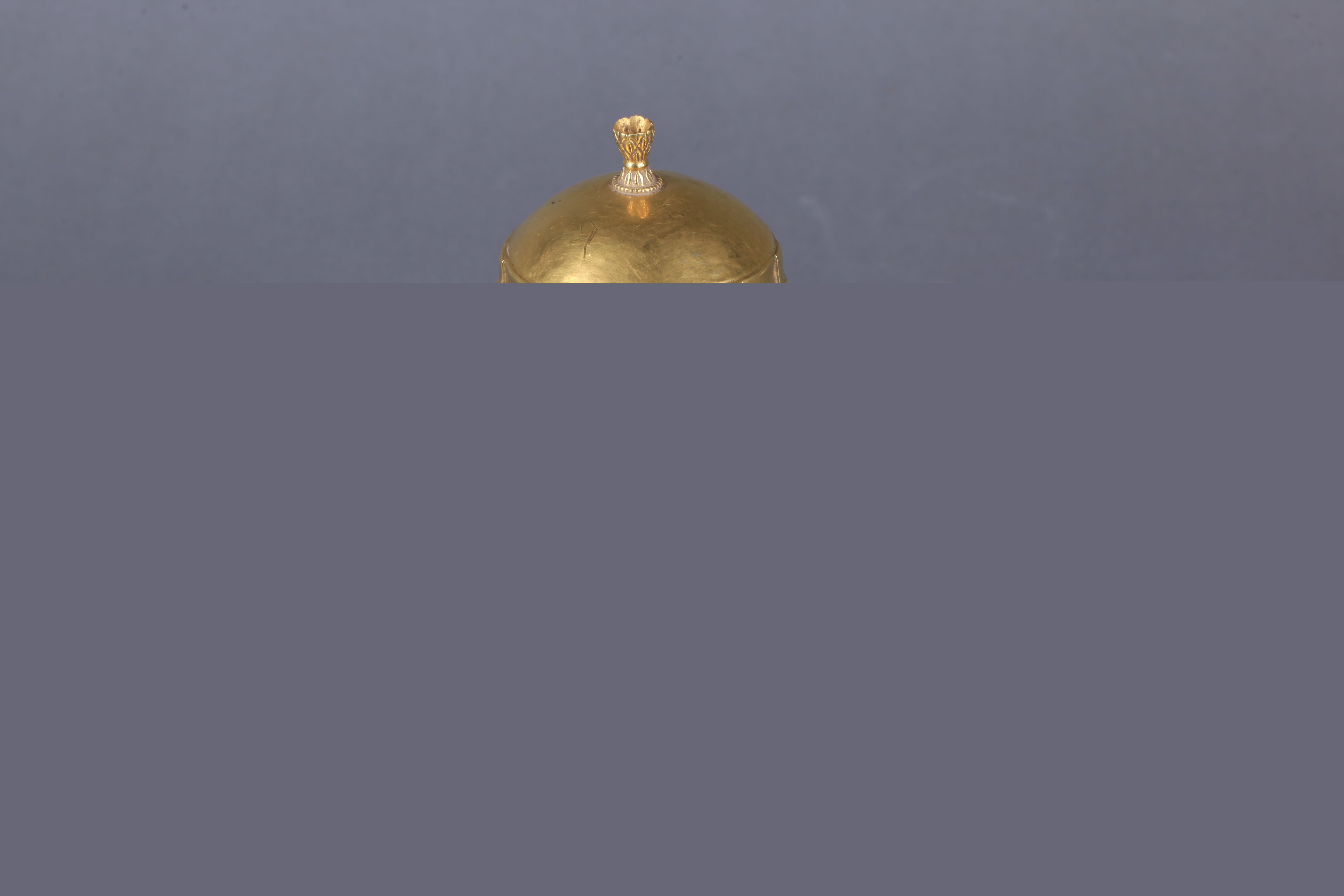鑲綠松石金壺,侈口卷沿,高頸溜肩鼓腹,假高圈足,平底。半球形壺蓋,蓋頂中央有聯珠座束腰蓮紋捉鈕,鈕頂鑲珠已佚,直邊下包壺口。蓋與壺頸一側用活頁形鉚榫相連,可上下翻轉,一側有扣舌可勾鎖封閉。壺肩部施凸弦紋一周,肩腹部鉚接一環形把,把上有花形指墊,墊中央鑲一圓形綠松石。有鮮明的中亞、粟特文化風貌,充分彰顯了唐代能工巧匠在外來文化交流中不斷創造、豐富的精湛工藝,所加工成的藝術品精致華美、光彩奪目,有著永恒的價值和無窮的魅力。