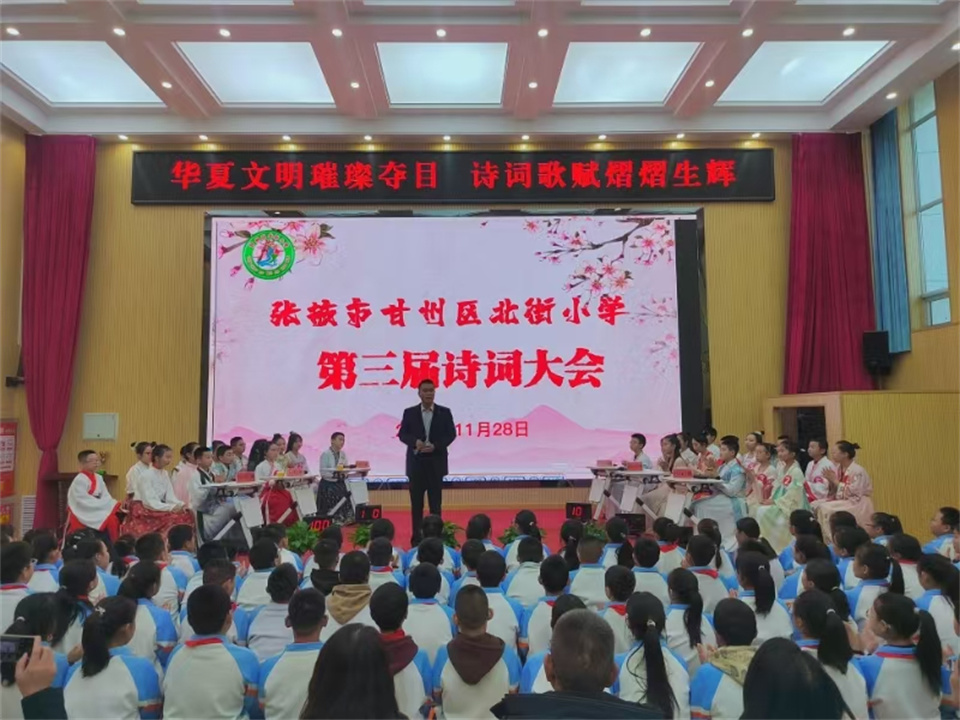 中國張掖網甘州訊  為弘揚詩詞文化,領略詩詞魅力,傳承詩詞經典,全面提高學生的文學素養。11月28日,甘州區北街小學第三屆詩詞大會隆重舉行。學校相關負責人、各年級代表及六年級全體師生四百多人參加此次活動。