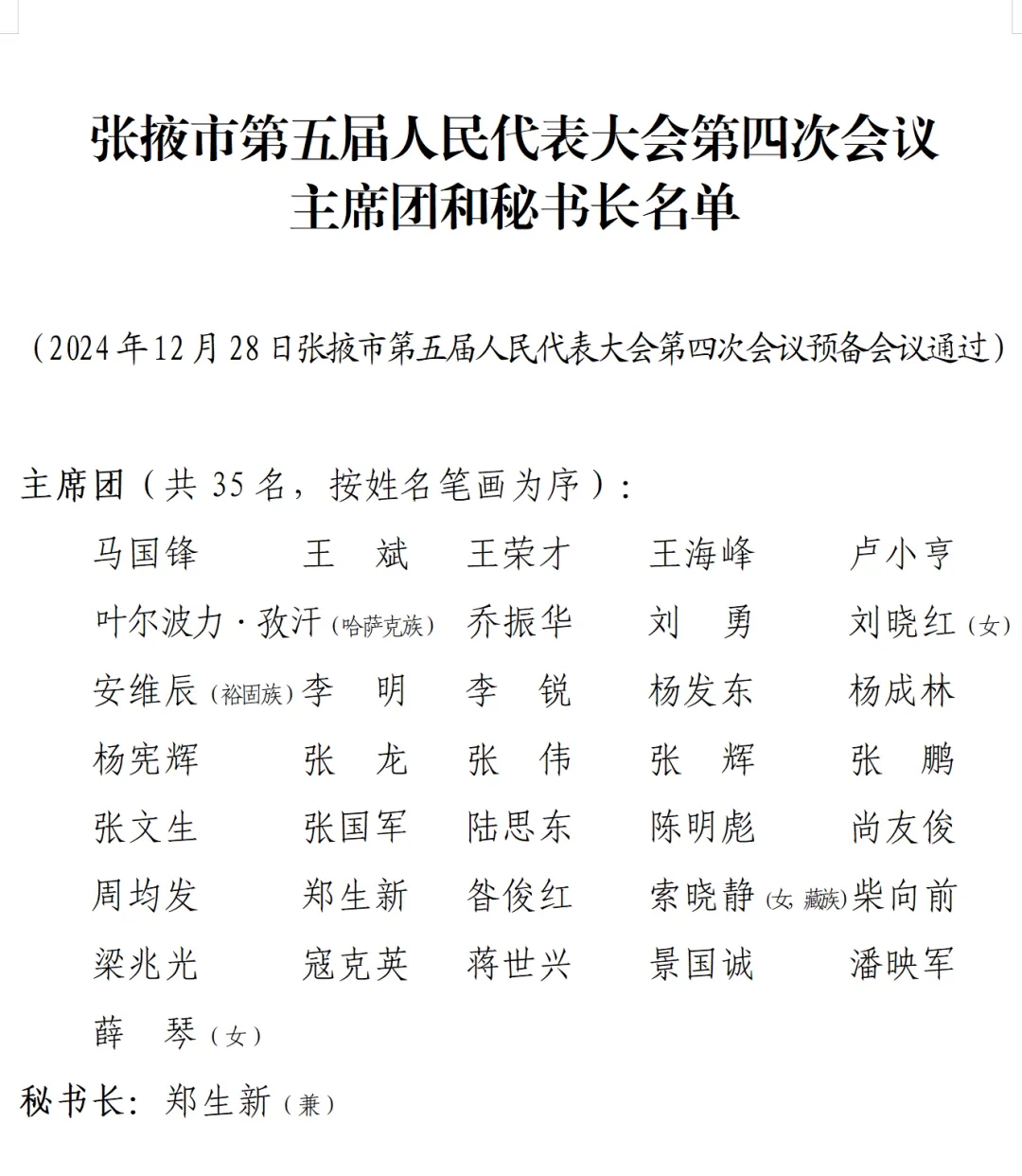 聚焦兩會 | 張掖市第五屆人民代表大會第四次會議主席團和秘書長名單