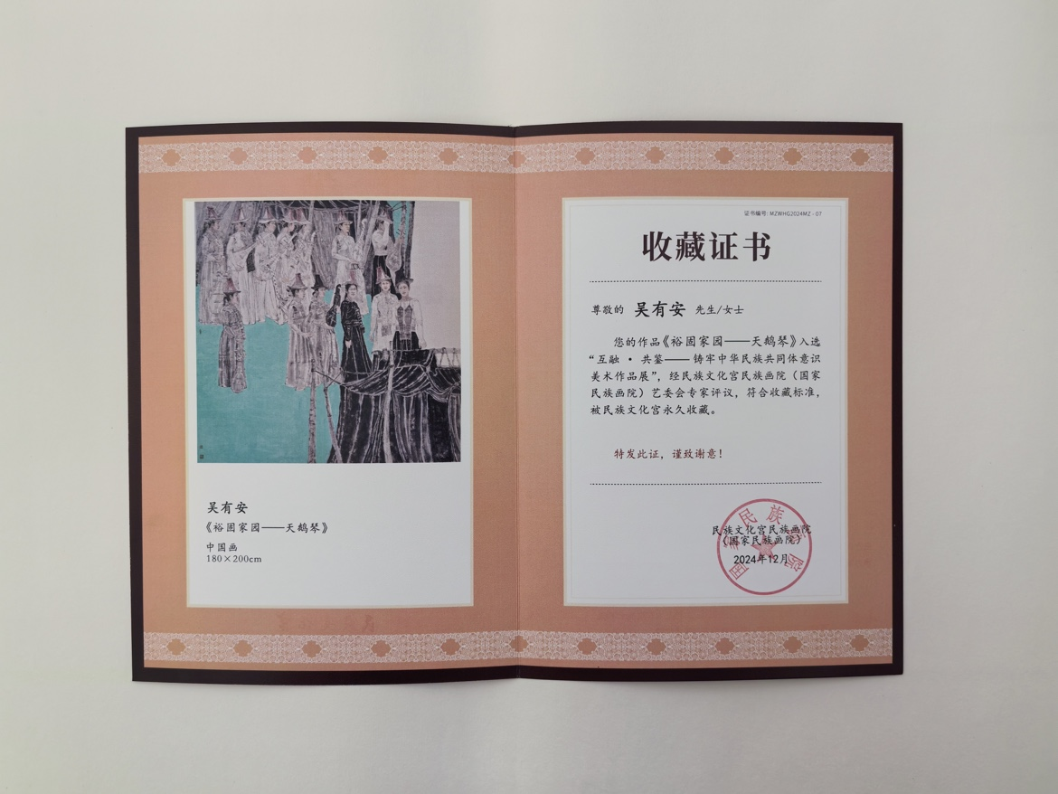 據(jù)悉,“互融·共鑒——鑄牢中華民族共同體意識美術(shù)作品展”于2024年12月在北京民族文化宮舉辦,吳有安作品《裕固家園——天鵝琴》以甘肅獨有少數(shù)民族裕固族的傳統(tǒng)樂器天鵝琴為主題,生動展現(xiàn)了裕固族人民的家園風情和深厚的文化底蘊。