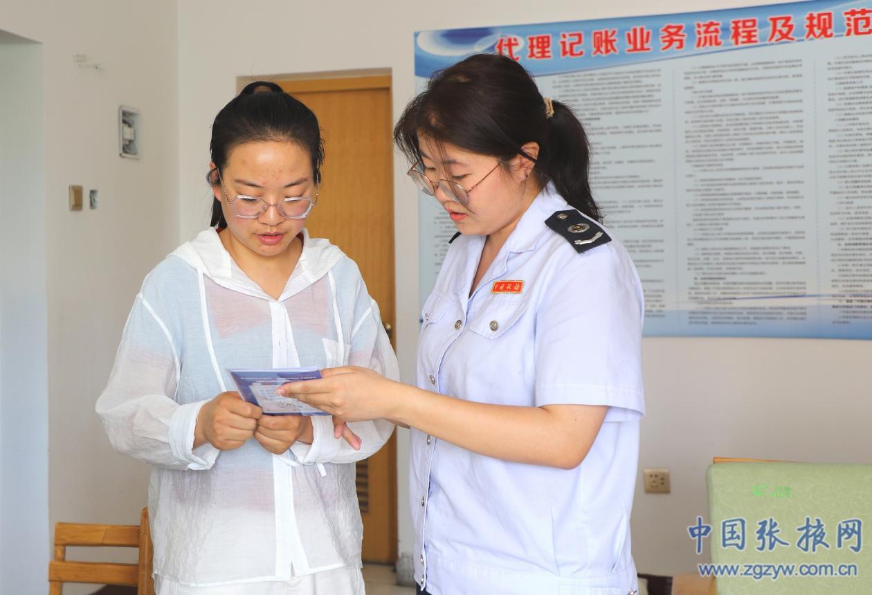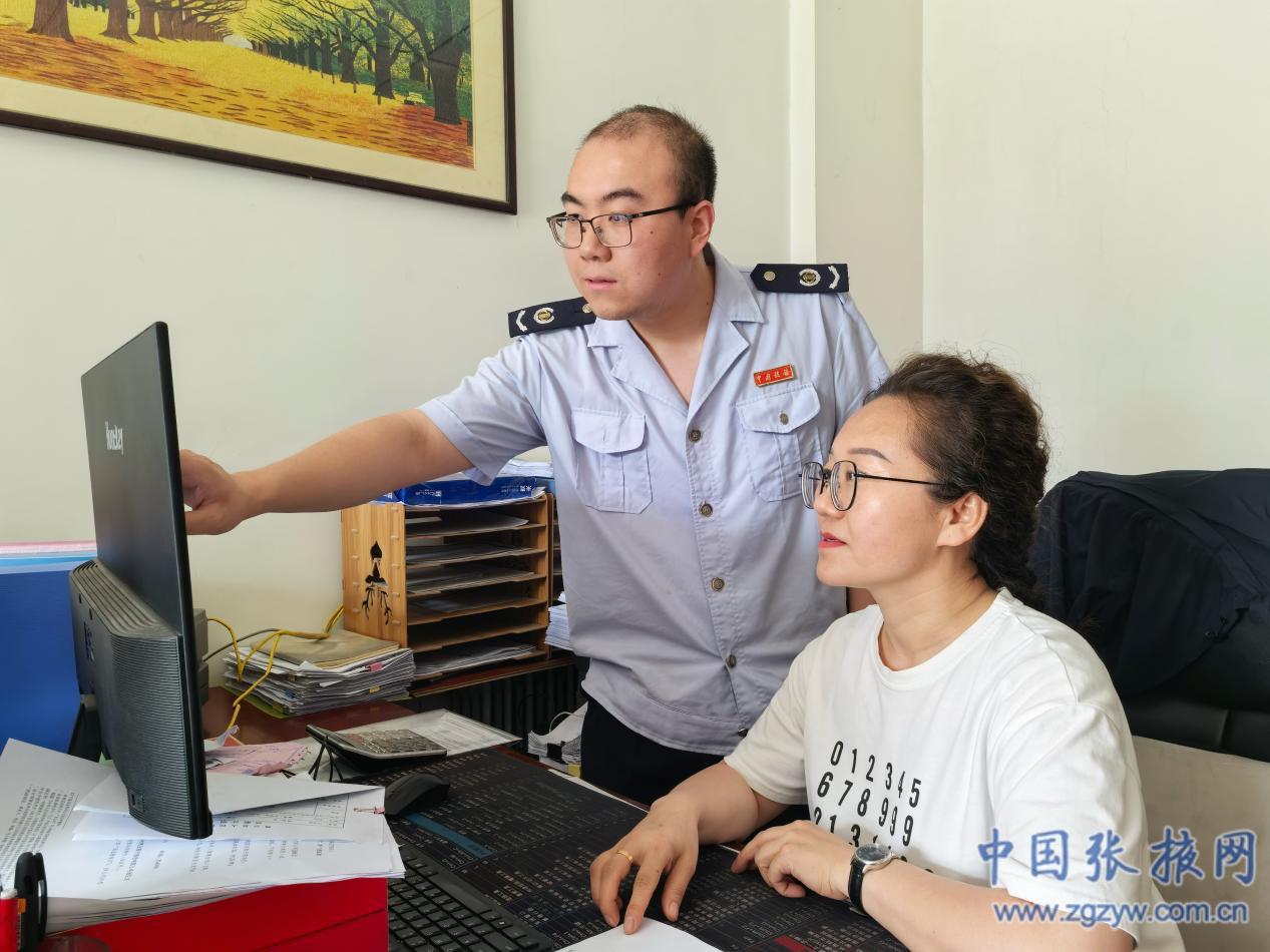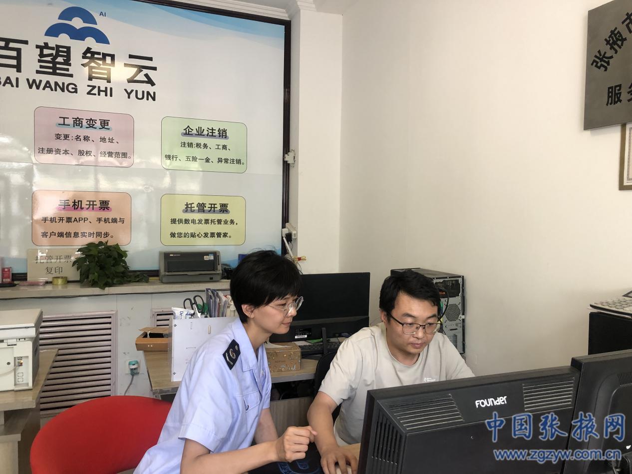 (圖為張掖市甘州區(qū)稅務(wù)局干部為張掖百望云信息有限公司進(jìn)行業(yè)務(wù)輔導(dǎo)