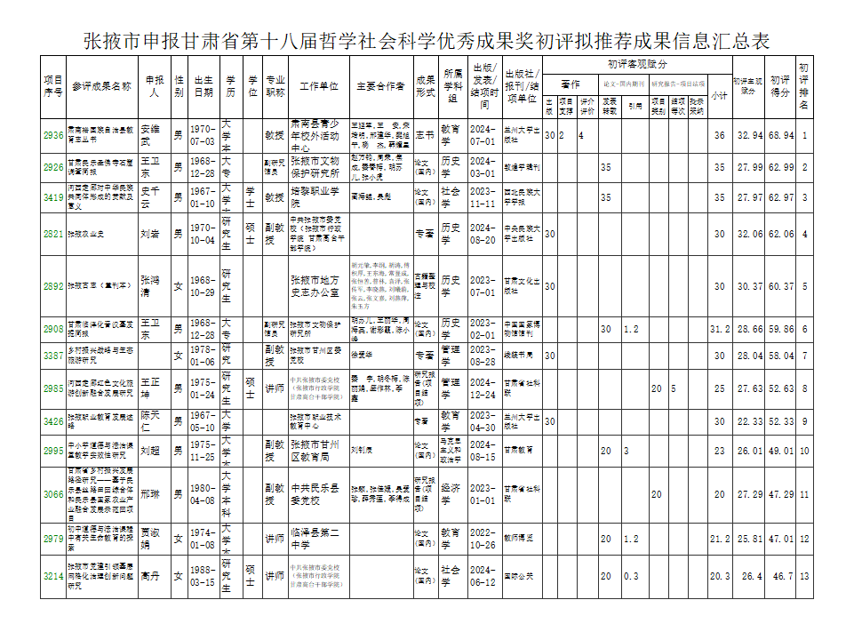 關于對張掖市申報甘肅省第十八屆哲學社會科學優秀成果獎初評擬推薦成果進行公示的公告