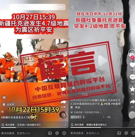 10月27日15時39分,在新疆吐魯番市托克遜縣發(fā)生4.7級地震,震源深度27公里。震中位于托克遜縣庫米什鎮(zhèn)南偏東,屬戈壁荒漠無人區(qū)域。地震發(fā)生后,個別網(wǎng)民為博取流量,罔顧事實,通過自媒體賬號發(fā)布“地震廢墟”“房屋倒塌”“搶險救援”等圖文信息。經(jīng)當?shù)貞惫芾砭趾藢?,上述信息均為謠言,與實際情況不符。此次地震未造成人員傷亡、無財產(chǎn)損失。