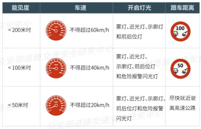 大霧天氣,正確使用霧燈,能有效預防交通事故的發生。霧天在高速公路上行駛時,能見度小于200米時,開啟霧燈、近光燈、示廓燈和前后位燈,車速不得超過每小時60公里,與同車道前車保持100米以上的距離;能見度小于100米時,開啟霧燈、近光燈、示廓燈、前后位燈和危險報警閃光燈,車速不得超過每小時40公里,與同車道前車保持50米以上的距離;能見度小于50米時,開啟霧燈、近光燈、示廓燈、前后位燈和危險報警閃光燈,車速不得超過每小時20公里,并從最近的出口盡快駛離高速公路